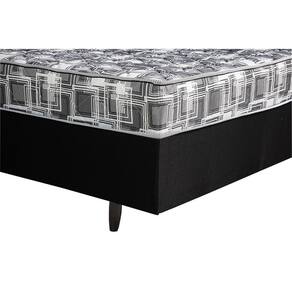 Caracteristicas: Molejo estrutural com molas ensacadas de arame de aco, bitola 1,70 mm, media de 199 molas/m Estrutura em caixa de madeira de eucalipto com 32 cm de altura Suporte medio de 150 kg/m Estrutura suporta ate 90 kg Tampo bordado com espuma flexivel D-26 kg/m, TNT e fibra de poliester 150 g/m Tecido faixa bordado com espuma flexivel D-20 kg/m e TNT Revestimento em poliester e TNT Produzido conforme protocolos de qualidade do INMETRO