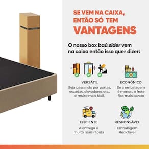 Importante sobre a : A é realizada até a portaria ou porta de entrada do indicado, desde que o acesso seja permitido. Para locais com portaria, a será feita no piso térreo. Não realizamos montagem, desmontagem, por escadas ou içamento. É responsabilidade do cliente verificar se as dimensões do produto são compatíveis com portas, elevadores e corredores. Evite imprevistos: confira todos os detalhes antes de concluir sua compra. MEDIDAS DO BOX:: [ A ] = 44 cm / 32 cm (Sem pés) [ L ] = 193 cm [ P ] = 203 cm | MEDIDAS INTERNAS DO BAÚ:: [ A ] = 26 cm [ L ] = 180 cm [ P ] = 193 cm | ALTURA DOS PÉS:: 12 cm | IDEAL PARA COLCHÃO DE ATÉ:: 193 cm | PESO:: 46Kg | SUPORTA ATÉ:: 120Kg por pessoa | MODELO:: Box Baú Base Casal King para Colchão de Desmontável | MARCA:: Sider | POSSUI PÉS:: Sim | MATERIAL DOS PÉS:: Polipropileno | QUANTIDADE DOS PÉS:: 9 | MATERIAL DA ESTRUTURA:: Eucalipto tratado reflorestado | ESPESSURA DO MATERIAL DA ESTRUTURA:: 2 cm | REVESTIMENTO:: Tecido Suede | ACOMPANHA COLCHÃO:: Não | DESMONTÁVEL:: Sim | DIFERENCIAL:: Praticidade no , armazenagem e montagem | GARANTIA:: 3 meses | ITENS INCLUSOS:: 1 Manual de montagem e 1 Box Baú | AVISO:: Importante sobre a : A é realizada até a portaria ou porta de entrada do indicado, desde que o acesso seja permitido. Para locais com portaria, a será feita no piso térreo. | Inclui manual de montagem: sim | Requer montagem: sim | Tamanho: King | Cor: Bege
