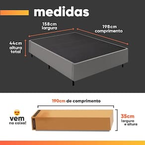 Importante sobre a : A é realizada até a portaria ou porta de entrada do indicado, desde que o acesso seja permitido. Para locais com portaria, a será feita no piso térreo. Não realizamos montagem, desmontagem, por escadas ou içamento. É responsabilidade do cliente verificar se as dimensões do produto são compatíveis com portas, elevadores e corredores. Evite imprevistos: confira todos os detalhes antes de concluir sua compra. MEDIDAS DO BOX:: [ A ] = 44 cm / 32 cm (Sem pés) [ L ] = 158 cm [ P ] = 198 cm | MEDIDAS INTERNAS DO BAÚ:: [ A ] = 26 cm [ L ] = 145 cm [ P ] = 190 cm | ALTURA DOS PÉS:: 12 cm | IDEAL PARA COLCHÃO DE ATÉ:: 158 cm | PESO:: 43Kg | SUPORTA ATÉ:: 120Kg por pessoa | MODELO:: Box Baú Base Casal Queen para Colchão de Desmontável | MARCA:: Sider | POSSUI PÉS:: Sim | MATERIAL DOS PÉS:: Polipropileno | QUANTIDADE DOS PÉS:: 9 | MATERIAL DA ESTRUTURA:: Eucalipto tratado reflorestado | ESPESSURA DO MATERIAL DA ESTRUTURA:: 2 cm | REVESTIMENTO:: Tecido Suede | ACOMPANHA COLCHÃO:: Não | DESMONTÁVEL:: Sim | DIFERENCIAL:: Praticidade no , armazenagem e montagem | GARANTIA:: 3 meses | ITENS INCLUSOS:: 1 Manual de montagem e 1 Box Baú | AVISO:: Importante sobre a : A é realizada até a portaria ou porta de entrada do indicado, desde que o acesso seja permitido. Para locais com portaria, a será feita no piso térreo. Não realizamos montagem, desmontagem, p | Inclui manual de montagem: Sim | Requer montagem: sim | Tamanho: Queen | Cor: Cinza