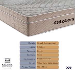 O conforto que sua casa precisa e a qualidade que você merece está na Kazamix! Durma com a Qualidade e Conforto que Você Merece! O Colchão Airtech Molas ensacadas Ortobom é a escolha perfeita para quem busca conforto e suporte. Equipado com um sistema de molas ensacadas, ele oferece suporte individualizado, garantindo o alinhamento correto da coluna e reduzindo os impactos dos movimentos durante o sono. O Euro Pillow proporciona uma camada extra de maciez, garantindo um sono ainda mais revigorante. Seu revestimento em tecido de malha e matelassê, junto com a lateral em suede, proporcionam um visual sofisticado, elevando ainda mais a estética do seu dormitório e agregando elegância ao ambiente. Além disso, o colchão conta com proteção antiácaro e antialérgico, criando um ambiente de sono mais saudável e ideal para quem busca bem-estar. Produzido com materiais de alta qualidade e a confiabilidade da Ortobom, líder em tecnologia e durabilidade, ele é feito para durar, oferecendo anos de conforto e suporte. Modelo: Airtech Molas ensacadas Marca: Ortobom Tamanho: Queen Dimensões: 158x198X25 (Largura x Comprimento x Altura) Conforto: Macio Sistema: Molas Ensacadas Pillow: Euro Pillow Peso Máximo recomendado: 120 kg (Por pessoa) Proteções: Antiácaro, antialérgico, antifungo, antimofo Garantia: 1 ano pelo FabricanteO conforto que sua casa precisa e a qualidade que você merece está na Kazamix! Eleve o conforto e a sofisticação do seu quarto com a Cama Box! Produzida em madeira de reflorestamento reforçada, a Cama Box combina qualidade, durabilidade e um design elegante, que confere leveza e modernidade ao seu dormitório. Sua estrutura robusta suporta até 150 kg por pessoa, garantindo a sustentação perfeita para o colchão e prolongando a vida útil do produto. Com uma altura ergonômica, ela oferece maior conforto ao deitar e levantar, enquanto o acabamento de alta qualidade se adapta a qualquer estilo de decoração, unindo praticidade e estilo. Não perca tempo! Adquira agora mesmo a sua Cama Box e transforme seu dormitório com conforto e elegância. Marca: KazaMix Modelo: Box Tamanho: Queen Dimensões: 158X198X35 (Largura x Comprimento x Altura) Estrutura: Madeira Peso máximo recomendado: 150 kg (Por Pessoa) Altura do Box: 25 cm Altura dos Pés: 10 cm Altura total: 35 cm Garantia: 03 meses Selo Ecologicamente Correto Atenção: Antes de finalizar sua compra, certifique-se de que as dimensões do produto sejam adequadas para serem transportadas pelos elevadores, portas, escadas e corredores de sua residência. Ressaltamos que não nos responsabilizamos pelo transporte do produto por meios específicos, como escadas, guinchos ou içamentos.