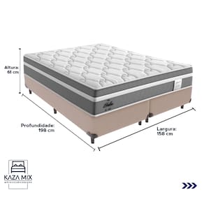 O conforto que sua casa precisa e a qualidade que você merece está na Kazamix! Apresentamos o Colchão Probel Berlim, a escolha ideal para quem busca conforto e qualidade. Com Molas Ensacadas e camada Euro Pillow, ele proporciona suporte individualizado e maciez extra para um sono tranquilo. A espuma D28 oferece durabilidade e conforto, enquanto o tecido em malha e jacquard garante um toque sofisticado e respirabilidade. Além disso, conta com proteções antiácaro e antialérgico, criando um ambiente saudável para o seu descanso. Invista no seu conforto com o Colchão Probel Berlim! Modelo: Berlim Marca: Probel Tamanho: Queen Dimensões: 158x198X26 (Largura x Comprimento x Altura) Conforto: Intermediário Sistema: Molas Ensacadas Pillow: Euro Pillow Peso Máximo recomendado: 110 kg (Por pessoa) Proteções: Antiácaro, antialérgico, antifungo, antimofo Garantia: 1 ano pelo FabricanteO conforto que sua casa precisa e a qualidade que você merece está na Kazamix! Eleve o conforto e a sofisticação do seu quarto com a Cama Box! Produzida em madeira de reflorestamento reforçada, a Cama Box combina qualidade, durabilidade e um design elegante, que confere leveza e modernidade ao seu dormitório. Sua estrutura robusta suporta até 150 kg por pessoa, garantindo a sustentação perfeita para o colchão e prolongando a vida útil do produto. Com uma altura ergonômica, ela oferece maior conforto ao deitar e levantar, enquanto o acabamento de alta qualidade se adapta a qualquer estilo de decoração, unindo praticidade e estilo. Não perca tempo! Adquira agora mesmo a sua Cama Box e transforme seu dormitório com conforto e elegância. Marca: KazaMix Modelo: Box Tamanho: Queen Dimensões: 158X198X35 (Largura x Comprimento x Altura) Estrutura: Madeira Peso máximo recomendado: 150 kg (Por Pessoa) Altura do Box: 25 cm Altura dos Pés: 10 cm Altura total: 35 cm Garantia: 03 meses Selo Ecologicamente Correto Atenção: Antes de finalizar sua compra, certifique-se de que as dimensões do produto sejam adequadas para serem transportadas pelos elevadores, portas, escadas e corredores de sua residência. Ressaltamos que não nos responsabilizamos pelo transporte do produto por meios específicos, como escadas, guinchos ou içamentos.
