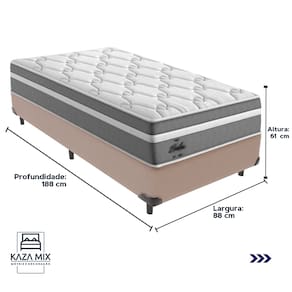 O conforto que sua casa precisa e a qualidade que você merece está na Kazamix! Apresentamos o Colchão Probel Berlim, a escolha ideal para quem busca conforto e qualidade. Com Molas Ensacadas e camada Euro Pillow, ele proporciona suporte individualizado e maciez extra para um sono tranquilo. A espuma D28 oferece durabilidade e conforto, enquanto o tecido em malha e jacquard garante um toque sofisticado e respirabilidade. Além disso, conta com proteções antiácaro e antialérgico, criando um ambiente saudável para o seu descanso. Invista no seu conforto com o Colchão Probel Berlim! Modelo: Berlim Marca: Probel Tamanho: Solteiro Dimensões: 88x188X32 (Largura x Comprimento x Altura) Conforto: Intermediário Sistema: Molas Ensacadas Pillow: Euro Pillow Peso Máximo recomendado: 110 kg (Por pessoa) Proteções: Antiácaro, antialérgico, antifungo, antimofo Garantia: 1 ano pelo FabricanteO conforto que sua casa precisa e a qualidade que você merece está na Kazamix! Eleve o conforto e a sofisticação do seu quarto com a Cama Box! Produzida em madeira de reflorestamento reforçada, a Cama Box combina qualidade, durabilidade e um design elegante, que confere leveza e modernidade ao seu dormitório. Sua estrutura robusta suporta até 150 kg por pessoa, garantindo a sustentação perfeita para o colchão e prolongando a vida útil do produto. Com uma altura ergonômica, ela oferece maior conforto ao deitar e levantar, enquanto o acabamento de alta qualidade se adapta a qualquer estilo de decoração, unindo praticidade e estilo. Não perca tempo! Adquira agora mesmo a sua Cama Box e transforme seu dormitório com conforto e elegância. Marca: KazaMix Modelo: Box Tamanho: Solteiro Dimensões: 88X188X35 (Largura x Comprimento x Altura) Estrutura: Madeira Peso máximo recomendado: 150 kg (Por Pessoa) Altura do Box: 25 cm Altura dos Pés: 10 cm Altura total: 35 cm Garantia: 03 meses Selo Ecologicamente Correto Atenção: Antes de finalizar sua compra, certifique-se de que as dimensões do produto sejam adequadas para serem transportadas pelos elevadores, portas, escadas e corredores de sua residência. Ressaltamos que não nos responsabilizamos pelo transporte do produto por meios específicos, como escadas, guinchos ou içamentos.