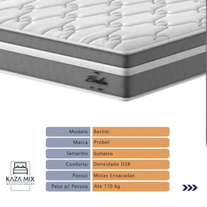 O conforto que sua casa precisa e a qualidade que você merece está na Kazamix! Apresentamos o Colchão Probel Berlim, a escolha ideal para quem busca conforto e qualidade. Com Molas Ensacadas (Molas Ensacadas) e camada Euro Pillow, ele proporciona suporte individualizado e maciez extra para um sono tranquilo. A espuma D28 oferece durabilidade e conforto, enquanto o tecido em malha e jacquard garante um toque sofisticado e respirabilidade. Além disso, conta com proteções antiácaro e antialérgico, criando um ambiente saudável para o seu descanso. Invista no seu conforto com o Colchão Probel Berlim! Modelo: Berlim Marca: Probel Tamanho: Solteiro Dimensões: 88x188X32 (Largura x Comprimento x Altura) Conforto: Intermediário Sistema: Molas Ensacadas Pillow: Euro Pillow Peso Máximo recomendado: 110 kg (Por pessoa) Proteções: Antiácaro, antialérgico, antifungo, antimofo Garantia: 1 ano pelo FabricanteO conforto que sua casa precisa e a qualidade que você merece está na Kazamix! Eleve o conforto e a sofisticação do seu quarto com a Cama Box! Produzida em madeira de reflorestamento reforçada, a Cama Box combina qualidade, durabilidade e um design elegante, que confere leveza e modernidade ao seu dormitório. Sua estrutura robusta suporta até 150 kg por pessoa, garantindo a sustentação perfeita para o colchão e prolongando a vida útil do produto. Com uma altura ergonômica, ela oferece maior conforto ao deitar e levantar, enquanto o acabamento de alta qualidade se adapta a qualquer estilo de decoração, unindo praticidade e estilo. Não perca tempo! Adquira agora mesmo a sua Cama Box e transforme seu dormitório com conforto e elegância. Marca: KazaMix Modelo: Box Tamanho: Solteiro Dimensões: 88X188X35 (Largura x Comprimento x Altura) Estrutura: Madeira Peso máximo recomendado: 150 kg (Por Pessoa) Altura do Box: 25 cm Altura dos Pés: 10 cm Altura total: 35 cm Garantia: 03 meses Selo Ecologicamente Correto Atenção: Antes de finalizar sua compra, certifique-se de que as dimensões do produto sejam adequadas para serem transportadas pelos elevadores, portas, escadas e corredores de sua residência. Ressaltamos que não nos responsabilizamos pelo transporte do produto por meios específicos, como escadas, guinchos ou içamentos.