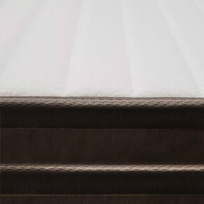 Orevestimento em Malha Lacê tem toque leve e agradável, enquanto a lateral em Linho Marrom dá um toque moderno e sofisticado ao visual. Possui tratamentos antialérgico e antiácaro, que mantêm o ambiente de sono mais saudável. Seu suporte é de até 80 kg por pessoa de cada lado.