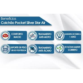 Dimensões(Cm): Comprimento(Profundidade): 203cm x Largura: 193cm x Altura: 32cm Vantagens Extras de Colchão - c/ Sistema Polyframe Tipo de Pillow - Pillow Top Europeu Tecido com Tratamento do Colchão - e Bordado do Revestimento do Colchão - Contínuo Forração Revestimento do Colchão - Malha de Alta Qualidade Forração do Revestimento Inferior do Colchão - Antiderrapante Tecido de Revestimento da Faixa Lateral do Colchão - Suede Modo de Utilização do Colchão - One Side Camadas Interna do Estofamento de Espuma do Colchão - D26 Tipo de Mola do Colchão - Nível de Firmeza do Colchão - Macio Peso Máximo Suportado do Colchão - 130 kg Certificação de Qualidade do Colchão - INMETRO Nossa Avaliação do Colchão - Qualidade Excelente Tempo de Garantia do Colchão - 12 meses