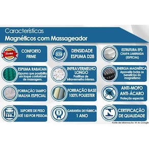 Dimensões(Cm): Comprimento(Profundidade): 203cm x Largura: 193cm x Altura: 34cm Vantagens Extras de Colchão - c/ Sistema Polyframe - EPS - Vibromassageador c/ Controle - c/ Controle Remoto Tecido com Tratamento do Colchão - e Bordado do Revestimento do Colchão - Contínuo Forração Revestimento do Colchão - Malha de Alta Qualidade Forração do Revestimento Inferior do Colchão - Antiderrapante Tecido de Revestimento da Faixa Lateral do Colchão - Decorativa Modo de Utilização do Colchão - One Side Camadas Interna do Estofamento de Espuma do Colchão - Viscoelástica - D20 - D33 Tipo de Mola do Colchão - Ensacadas Nível de Firmeza do Colchão - Firme Peso Máximo Suportado do Colchão - 180 kg Certificação de Qualidade do Colchão - Qualidade Aprovada - Qualidade Costa Rica - INMETRO - Selo Abicol Nossa Avaliação do Colchão - Qualidade Excelente Tempo de Garantia do Colchão - 12 meses