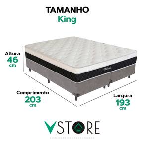 A tecnologia que a sua casa merece está na V-Store! O Conjunto Colchão Dallas e Base Box Bravus oferece a combinação perfeita de conforto, durabilidade e estilo. O Colchão Dallas, com molas ensacadas, espuma D33, Euro Pillow e tecnologia EPS, proporciona excelente suporte e conforto térmico. Já a Base Box Bravus, feita com madeira reflorestada e revestida com tecido sintético, garante resistência, durabilidade e um design sofisticado que complementa qualquer ambiente. Ideal para quem busca praticidade e elegância no quarto. Adquira já a sua Base Box Bravus V-Store e transforme seu dormitório com qualidade e estilo!Característica Do Colchão: Modelo: DallasMarca: V-StoreTamanho: KingDimensões: 193x20x203 (Largura x Altura x Comprimento)Conforto: MédioSistema: Molas EnsacadasPillow: Euro PillowPeso Máximo recomendado: 150 kg (Por pessoa)Proteções: Antiácaro, antialérgico, antifungo, antimofoGarantia: 12 Meses (Espuma) / 10 anos ( Conjunto de Molas Ensacadas)Característica Da Base: Marca: V-StoreModelo: BravusTamanho: KingDimensões: 193x44x203 (Largura x Altura x Comprimento)Estrutura: MadeiraPeso máximo recomendado: 150 kg (Por Pessoa)Altura do Box: 26 cmAltura dos Pés: 6 cmAltura total: 44 cmGarantia: 12 Meses (Estrutura) / 3 meses (Tecido)Selo Ecologicamente CorretoAtenção:- Antes de finalizar sua compra, recomendamos que verifique se as dimensões do produto são adequadas para serem transportadas pelos elevadores, portas, escadas e corredores de sua residência. Ressaltamos que não nos responsabilizamos pelo transporte do produto por meios específicos, como escadas, guinchos ou içamentos.- É possível que hajam leves variações de cor de acordo com o dispositivo que está sendo utilizado como smartphones, computadores, monitores e outros.