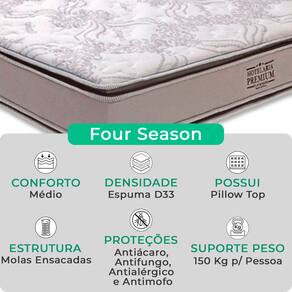 A tecnologia que a sua casa merece está na V-Store! O Conjunto Colchão Four Seasons e Base Box Bravus oferece o equilíbrio perfeito entre conforto e funcionalidade. O colchão, com molas ensacadas, pillow top e EPS, garante excelente suporte e conforto térmico, ideal para casais. Já a base, feita de madeira reflorestada e revestida em tecido sintético, oferece durabilidade e praticidade, com amplo espaço para armazenamento.Característica Do Colchão: Modelo: Four SeasonMarca: V-StoreTamanho: KingDimensões: 193x30x203 (Largura x Altura x Comprimento)Conforto: MédioSistema: Molas EnsacadasPillow: Pillow TopPeso Máximo recomendado: 150 kg (Por pessoa)Proteções: Antiácaro, antialérgico, antifungo, antimofoGarantia: 12 Meses (Espuma) / 10 anos ( Conjunto de Molas Ensacadas)Característica Da Base: Marca: V-StoreModelo: BravusCor do Box: PretoTamanho: KingDimensões: 193x44x203 (Largura x Altura x Comprimento)Estrutura: MadeiraPeso máximo recomendado: 150 kg (Por Pessoa)Altura do Box: 26 cmAltura dos Pés: 6 cmAltura total: 44 cmGarantia: 12 Meses (Estrutura) / 3 meses (Tecido)Selo Ecologicamente CorretoAtenção:- Antes de finalizar sua compra, recomendamos que verifique se as dimensões do produto são adequadas para serem transportadas pelos elevadores, portas, escadas e corredores de sua residência. Ressaltamos que não nos responsabilizamos pelo transporte do produto por meios específicos, como escadas, guinchos ou içamentos.- É possível que hajam leves variações de cor de acordo com o dispositivo que está sendo utilizado como smartphones, computadores, monitores e outros.