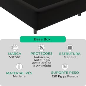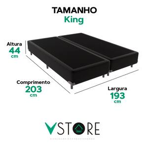 A tecnologia que a sua casa merece está na V-Store!A Base Box Bravus da V-Store une funcionalidade e elegância, sendo a escolha perfeita para quem busca praticidade e durabilidade. Feita com madeira reflorestada, ela oferece excelente sustentação para o seu colchão, enquanto seu revestimento em tecido sintético garante resistência e facilidade de manutenção. Seu design compacto e sofisticado complementa a decoração do quarto com estilo.Com capacidade para 150 kg por pessoa e Selo Ecologicamente Correto, a Base Box Bravus oferece resistência, sustentabilidade e versatilidade para o seu ambiente.Adquira já a sua Base Box Bravus V-Store e transforme seu dormitório com qualidade e estilo!CARACTERÍSTICAS DO PRODUTOMarca: V-StoreModelo: BravusCor do Box: PretoTamanho: KingDimensões: 193x44x203 (Largura x Altura x Comprimento)Estrutura: MadeiraPeso máximo recomendado: 150 kg (Por Pessoa)Altura do Box: 26 cmAltura dos Pés: 6 cmAltura total: 44 cmGarantia: 12 Meses (Estrutura) / 3 meses (Tecido)Selo Ecologicamente CorretoAtenção:- Antes de finalizar sua compra, recomendamos que verifique se as dimensões do produto são adequadas para serem transportadas pelos elevadores, portas, escadas e corredores de sua residência. Ressaltamos que não nos responsabilizamos pelo transporte do produto por meios específicos, como escadas, guinchos ou içamentos.- É possível que hajam leves variações de cor de acordo com o dispositivo que está sendo utilizado como smartphones, computadores, monitores e outros.