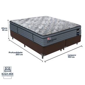 Bem-vindo(a) ao nosso catálogo! Apresentamos a você uma descrição completa sobre esse produto: A marca SealyEntre as personalidades que usam e usaram os colchões da marca Sealy estão a cantora Adele, Rainha Elizabeth II, a apresentadora Ellen DeGeneres e o jogador de basquete LeBron James. Atendendo também os hotéis da Disney, Copacabana Palace, Hard Rock Hotels e outros. Referência na fabricação de colchões de alta qualidade, a empresa foi fundada em 1881. Investindo em tecnologia de ponta e materiais premium para produzir produtos duráveis e confortáveis, é reconhecida por diversos consumidores famosos em todo o mundo. Modelo: CharlotteNível de Conforto: MacioSuporte de peso: 240 quilos (120kg por pessoa)Molas: Molas Ensacadas IndividualmentePillow: Pillow CloudEspuma: D33 e D28Altura: 34cmTecido: Tampo em Malha MarganTransforme suas noites de sono com Colchão Charlotte Sealy de 34cm, onde suavidade e suporte se encontram em perfeita harmonia. Com sua estrutura de Molas Ensacadas, ele se adapta às curvas do seu corpo, proporcionando um conforto macio e um suporte firme exatamente onde você precisa. Suportando até 240 kg, é durável e ideal para diferentes tipos de usuários. A tecnologia Posturepedic garante suporte extra nas áreas de maior pressão, ajudando a manter uma postura correta e promovendo um descanso profundo. As molas ensacadas individualmente trabalham de forma independente, minimizando a transferência de movimento e permitindo um sono tranquilo, mesmo que seu parceiro se mova durante a noite. O colchão é equipado com uma camada Pillow Cloud que intensifica a suavidade, e um tampo em malha Margan que regula a umidade e dissipa o calor, mantendo o colchão sempre fresco e confortável. A lateral em Jacquard Plano adiciona durabilidade e um toque de elegância ao colchão. Com fibras siliconadas e espumas variadas que aliviam a pressão e mantêm o suporte firme, o Colchão Charlotte Sealy é perfeito para uma noite de sono reparadora. Suas bordas firmes evitam o afundamento e ampliam a área útil do colchão, oferecendo mais espaço para relaxar. O Colchão Charlotte Sealy combina tecnologia avançada e um design inteligente, proporcionando uma experiência luxuosa de descanso. Transforme suas noites com um sono revitalizante e adquira o seu hoje mesmo! Além de tudo, esse produto acompanha a Cama Box da Kaza Mix e assim se torna um conjunto perfeito para o seu quarto! Marca: Kaza MixCor do Box: MarromTamanho: KingMaterial dos pés: MadeiraEstrutura: MadeiraPeso máximo recomendado: Até 150kg de cada ladoLargura: 193cmComprimento: 203cmAltura dos pés: 12cmAltura total: 42cmGarantia: 03 mesesSelo Ecologicamente CorretoAtenção: - Antes de finalizar sua compra, recomendamos que verifique se as dimensões do produto são adequadas para serem transportadas pelos elevadores, portas, escadas e corredores de sua residência. Ressaltamos que não nos responsabilizamos pelo transporte do produto por meios específicos, como escadas, guinchos ou içamentos. - É possível que hajam leves variações de cor de acordo com o dispositivo que está sendo utilizado como smartphones, computadores, monitores e outros.