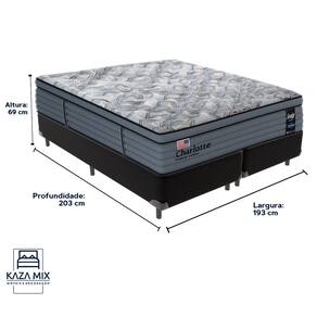 Bem-vindo(a) ao nosso catálogo! Apresentamos a você uma descrição completa sobre esse produto: A marca SealyEntre as personalidades que usam e usaram os colchões da marca Sealy estão a cantora Adele, Rainha Elizabeth II, a apresentadora Ellen DeGeneres e o jogador de basquete LeBron James. Atendendo também os hotéis da Disney, Copacabana Palace, Hard Rock Hotels e outros. Referência na fabricação de colchões de alta qualidade, a empresa foi fundada em 1881. Investindo em tecnologia de ponta e materiais premium para produzir produtos duráveis e confortáveis, é reconhecida por diversos consumidores famosos em todo o mundo. Modelo: CharlotteNível de Conforto: MacioSuporte de peso: 240 quilos (120kg por pessoa)Molas: Molas Ensacadas IndividualmentePillow: Pillow CloudEspuma: D33 e D28Altura: 34cmTecido: Tampo em Malha MarganTransforme suas noites de sono com Colchão Charlotte Sealy de 34cm, onde suavidade e suporte se encontram em perfeita harmonia. Com sua estrutura de Molas Ensacadas, ele se adapta às curvas do seu corpo, proporcionando um conforto macio e um suporte firme exatamente onde você precisa. Suportando até 240 kg, é durável e ideal para diferentes tipos de usuários. A tecnologia Posturepedic garante suporte extra nas áreas de maior pressão, ajudando a manter uma postura correta e promovendo um descanso profundo. As molas ensacadas individualmente trabalham de forma independente, minimizando a transferência de movimento e permitindo um sono tranquilo, mesmo que seu parceiro se mova durante a noite. O colchão é equipado com uma camada Pillow Cloud que intensifica a suavidade, e um tampo em malha Margan que regula a umidade e dissipa o calor, mantendo o colchão sempre fresco e confortável. A lateral em Jacquard Plano adiciona durabilidade e um toque de elegância ao colchão. Com fibras siliconadas e espumas variadas que aliviam a pressão e mantêm o suporte firme, o Colchão Charlotte Sealy é perfeito para uma noite de sono reparadora. Suas bordas firmes evitam o afundamento e ampliam a área útil do colchão, oferecendo mais espaço para relaxar. O Colchão Charlotte Sealy combina tecnologia avançada e um design inteligente, proporcionando uma experiência luxuosa de descanso. Transforme suas noites com um sono revitalizante e adquira o seu hoje mesmo! Além de tudo, esse produto acompanha a Cama Box da Kaza Mix e assim se torna um conjunto perfeito para o seu quarto! Marca: Kaza MixCor do Box: PretoTamanho: KingMaterial dos pés: MadeiraEstrutura: MadeiraPeso máximo recomendado: Até 150kg de cada ladoLargura: 193cmComprimento: 203cmAltura dos pés: 12cmAltura total: 42cmGarantia: 03 mesesSelo Ecologicamente CorretoAtenção: - Antes de finalizar sua compra, recomendamos que verifique se as dimensões do produto são adequadas para serem transportadas pelos elevadores, portas, escadas e corredores de sua residência. Ressaltamos que não nos responsabilizamos pelo transporte do produto por meios específicos, como escadas, guinchos ou içamentos. - É possível que hajam leves variações de cor de acordo com o dispositivo que está sendo utilizado como smartphones, computadores, monitores e outros.