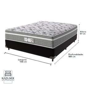 Bem-vindo(a) ao nosso catálogo!Apresentamos a você uma descrição completa sobre esse produto:Primeira marca a fabricar colchões em escala industrial no Brasil, a Probel sempre apresentou novidades ao mercado. Entre elas, estão os sistemas exclusivos de molejo Multilastic e de espumação Uniblock.Modelo: EvolutionNível de Conforto: Intermediário Suporte de peso: 240 quilos (120 kg por pessoa)Molas: Molas EnsacadasPillow: EuropillowEspuma: D28Altura: 32 cmTecido:Bordado em MatelassêTransforme suas noites com o Colchão Evolution, onde tecnologia e conforto se encontram para proporcionar o descanso perfeito. Com molas ensacadas e espuma de densidade D28, ele oferece o suporte ideal para alinhar sua coluna e aliviar pontos de pressão, garantindo um sono reparador e sem interrupções.O acabamento em poliéster diamante traz um toque de luxo, enquanto o pillow euro adiciona uma camada extra de conforto, fazendo você se sentir em um verdadeiro abraço a cada noite. Além disso, o tratamento antiácaro e antialérgico promove um ambiente mais saudável, ideal para quem busca bem-estar e saúde no seu descanso.Com suporte de peso de até 120 kg por pessoa, o Evolution é robusto e durável, feito para acompanhar você por muitos anos. Não perca a chance de transformar suas noites com o Colchão Evolution e sinta a diferença de um sono verdadeiramente revitalizante!Além de tudo, esse produto acompanha a Cama Box da Kaza Mix e assim se torna um conjunto perfeito para o seu quarto!Marca: Kaza MixCor do Box: PretoTamanho: CasalMaterial dos pés: MadeiraEstrutura: MadeiraPeso máximo recomendado: Até 150kg de cada ladoLargura: 138cmComprimento: 188cmAltura dos pés: 12cmAltura total: 42cmGarantia: 03 mesesSelo Ecologicamente CorretoAtenção: - Antes de finalizar sua compra, recomendamos que verifique se as dimensões do produto são adequadas para serem transportadas pelos elevadores, portas, escadas e corredores de sua residência. Ressaltamos que não nos responsabilizamos pelo transporte do produto por meios específicos, como escadas, guinchos ou içamentos.- É possível que hajam leves variações de cor de acordo com o dispositivo que está sendo utilizado como smartphones, computadores, monitores e outros.