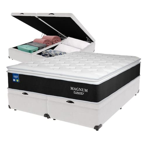 Colchão: Modelo: Magnum; Marca: Plumatex; Tamanho: Queen; Dimensões: 158x198x18cm; (largura x comprimento x altura) Conforto: Molas Ensacadas, Espuma D26, Pillow Top High Tech; Proteções: Antiácaro, antialérgico, antifungo, antimofo; Possui: Malha Chronos 180 g/m; Peso máximo recomendado: até 110Kg (por pessoa); Garantia: 03 meses;