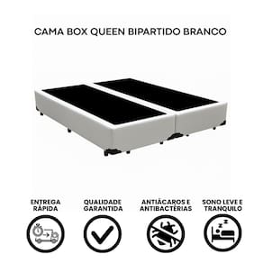 Tamanho Queen: 158x198 cm Bipartida: Mais praticidade na hora da entrega e montagem Cor: Branco Tecido: Sintético Estrutura reforçada: Suporte firme e durável Revestimento de qualidade: Sofisticação e resistência Compatível com todos os colchões padrão Queen Ideal para apartamentos, escadas estreitas e elevadores pequenos