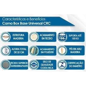 Dimensões(Cm): Comprimento(Profundidade): 198cm x Largura: 158cm x Altura: 33cm Características Gerais da Cama Box - Não acompanha Cantoneira Características Internas Cama Box - Estrutura de Madeira Forração Revestimento da Cama Box - Tecido - Antiderrapante - Poliéster - Tecido de Alta Qualidade Cor da Forração Revestimento Cama Box - Branco Suporte de Peso da Cama Box - 150 Kg Sobre os Pés para Cama Box - Pés foto ilustrativa - Pés Fixos Madeira/ABS Altura dos pés da Cama Box - 12cm Altura da Cama Box com os pés - 32 cm altura Outras Vantagens da Cama Box - Como Escolher o Colchão do seu Conjunto Box - Outras Informações da Cama Box Base Sobre a Cama Box Base - Informações da Cama Box Base - Vantagens Tempo de Garantia da Cama Box - 3 meses Certificação de Qualidade - Qualidade Aprovada - Selo Ecologicamente Correto - Garantia de Qualidade Costa Rica - Certificação de Segurança Nossa Avaliação da Cama Box - Qualidade Muito Boa