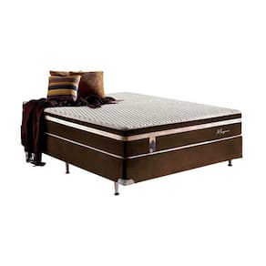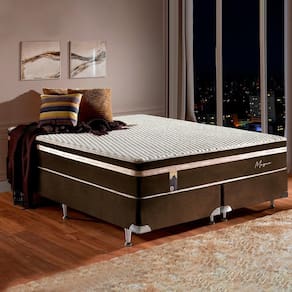 Colchão possui tampo em malha 84% Poliéster 16% Viscose Gramatura 778g/m2, Perfilado High Tech que possui a cada 12cm uma pastilha de magnético e uma de Infra vermelho, 10 cm espuma convencional densidade 33kg/m , certificada, fabricação própria, 8 pontos de massagem distribuídas 4 para cada lado , poliestireno Expandido de 8cm, Espuma convencional Densidade 20kg/m de cm ao fundo tecido plano 100% Poliéster Gramatura 97g/m, e na sua lateral com tecido Veludo Marrom 100% Poliéster com toque macio dando mais conforto. Sua Base luxuosa produzidas por madeira reflorestáveis de eucalipto, com pés de metal de 12cm, revestido em veludo Marrom 100% Poliéster com toque macio.