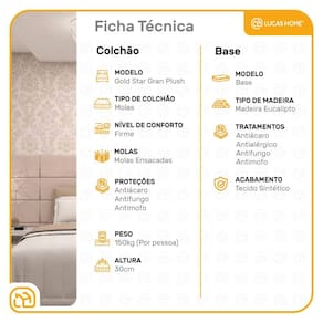 Sejam bem-vindos(as) a Lucas Home! Pensando em seu conforto e praticidade, criamos esse conjunto desenvolvido com tecnologias avançadas se tornando eficiente e ecológico garantindo excelentes noites de sono e descanso.A base box é confeccionada com madeira de reflorestamento, possuindo tratamentos anticupim e antimofo. Seu revestimento de material sintético de alta qualidade agrega valor e sofisticação ao quarto. O Colchão Gold Star Gran Plush é composto de Espuma de látex natural que se ajusta ao corpo e proporciona máximo conforto, maciez e durabilidade. Contém tecnologia de molas e sistema One Face. Composto de Bouclê no tampo e Malha 3D, Poliéster e Polipropileno, dando maior sofisticação e comodidade e ainda suporta até 150kg .IMPORTANTE: IMAGENS MERAMENTE ILUSTRATIVAS. (A LUCAS HOME não trabalha com móveis planejados. Podendo haver pequenas variações nas medidas e cores do produto/A cor do produto poderá variar de acordo com a tela de visualização/Os enfeites, eletrônicos e decoração não acompanham). **A LUCAS HOME não disponibiliza no momento o serviço de montagem, sendo de total responsabilidade do comprador. A LUCAS HOME Recomenda que a montagem seja feita por um profissional da área. **ATENÇÃO: Verifique se as dimensões dos produtos passam por elevadores, portas, escadas e corredores. A LUCAS HOME Não se responsabiliza pelo transporte dos produtos por escadas, guinchos, içamentos ou quaisquer outros meios específicos de transporte.Especificações Técnicas Base Box:- Marca: Lucas Home;- Material: Madeira Tratada;- Peso máximo recomendado: até 100Kg (por pessoa);- Altura da base: 25cm;- Altura dos pés: 10cm;- Revestimento: Material Sintético;- Garantia: 12 meses na estrutura;- Dimensões do produto (largura x comprimento x altura) 158x198x35cm.Especificações Técnicas Colchão:- Marca: Castor;- Proteções: Antiácaro - Antifungo - Antimofo;- Acabamento: Bouclê, Malha 3D e Poliéster;- Pillow Top: Possui;- Matéria prima: Molas;- Sistema One Face;- EPS Poliestireno Expansível: Não Possui;- Tipo de conforto: Firme;- Peso máximo recomendado: até 150kg (por pessoa);- Garantia: 24 meses;- Dimensões do produto (largura x comprimento x altura) 158x198x30cm.