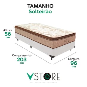 A tecnologia que a sua casa merece está na V-Store! A cama Box da V-Store é a escolha perfeita para quem busca conforto e praticidade. Com o colchão Victory Solteiro, você garante noites de sono tranquilas, com seu toque macio e sistema de molas ensacadas que proporcionam suporte adequado e independência de movimentos. O Pillow Euro Pillow oferece suavidade extra, e a tecnologia EPS adiciona resistência e durabilidade ao colchão. Além disso, ele possui proteções contra ácaros, fungos, mofo e alergias, promovendo um ambiente de sono mais saudável. O colchão suporta até 150 kg por pessoa e vem com garantia de 12 meses.A base box da V-Store é feita com materiais resistentes e de fácil manutenção, ideal para quem busca praticidade e um design simples e elegante. Com 38 cm de altura, ela oferece a estabilidade necessária para o seu colchão, completando o conjunto perfeito para o seu quarto. Adquira a cama Box da V-Store e experimente o conforto e a qualidade que sua casa merece!Característica Do Colchão: Modelo: VictoryMarca: V-StoreTamanho: SolteirãoDimensões: 96x30x203 (Largura x Altura x Comprimento)Conforto: MédioSistema: Molas EnsacadasPillow: Euro PillowPeso Máximo recomendado: 150 kg (Por pessoa)Proteções: Antiácaro, antialérgico, antifungo, antimofoGarantia: 12 Meses (Espuma) / 10 anos ( Conjunto de Molas Ensacadas)Característica Da Base: Marca: V-StoreModelo: BravusCor do Box: BrancoTamanho: SolteirãoDimensões: 96x44x203 (Largura x Altura x Comprimento)Estrutura: MadeiraPeso máximo recomendado: 150 kg (Por Pessoa)Altura do Box: 26 cmAltura dos Pés: 6 cmAltura total: 44 cmGarantia: 12 Meses (Estrutura) / 3 meses (Tecido)Selo Ecologicamente CorretoAtenção:- Antes de finalizar sua compra, recomendamos que verifique se as dimensões do produto são adequadas para serem transportadas pelos elevadores, portas, escadas e corredores de sua residência. Ressaltamos que não nos responsabilizamos pelo transporte do produto por meios específicos, como escadas, guinchos ou içamentos.- É possível que hajam leves variações de cor de acordo com o dispositivo que está sendo utilizado como smartphones, computadores, monitores e outros.