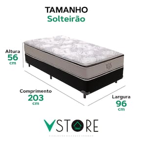 A tecnologia que a sua casa merece está na V-Store! O Conjunto Colchão Four Seasons e Base Box Bravus oferece o equilíbrio perfeito entre conforto e funcionalidade. O colchão, com molas ensacadas, pillow top e EPS, garante excelente suporte e conforto térmico, ideal para casais. Já a base, feita de madeira reflorestada e revestida em tecido sintético, oferece durabilidade e praticidade, com amplo espaço para armazenamento.Característica Do Colchão: Modelo: Four SeasonMarca: V-StoreTamanho: SolteirãoDimensões: 96x30x203 (Largura x Altura x Comprimento)Conforto: MédioSistema: Molas EnsacadasPillow: Pillow TopPeso Máximo recomendado: 150 kg (Por pessoa)Proteções: Antiácaro, antialérgico, antifungo, antimofoGarantia: 12 Meses (Espuma) / 10 anos ( Conjunto de Molas Ensacadas)Característica Da Base: Marca: V-StoreModelo: BravusTamanho: SolteirãoDimensões: 96x44x203 (Largura x Altura x Comprimento)Estrutura: MadeiraPeso máximo recomendado: 150 kg (Por Pessoa)Altura do Box: 26 cmAltura dos Pés: 6 cmAltura total: 44 cmGarantia: 12 Meses (Estrutura) / 3 meses (Tecido)Selo Ecologicamente CorretoAtenção:- Antes de finalizar sua compra, recomendamos que verifique se as dimensões do produto são adequadas para serem transportadas pelos elevadores, portas, escadas e corredores de sua residência. Ressaltamos que não nos responsabilizamos pelo transporte do produto por meios específicos, como escadas, guinchos ou içamentos.- É possível que hajam leves variações de cor de acordo com o dispositivo que está sendo utilizado como smartphones, computadores, monitores e outros.