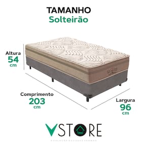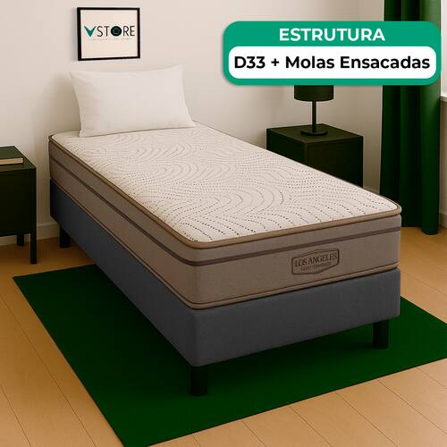 A tecnologia que a sua casa merece está na V-Store! O Conjunto Colchão Los Angeles + Base Box Baú Bravus da V-Store oferece conforto e funcionalidade. O colchão, com molas ensacadas e sistema EPS, garante suporte ideal, conforto térmico e proteção antiácaro. A base box, com amplo espaço de armazenamento, é feita de madeira reflorestada e revestida com tecido resistente, proporcionando praticidade e sofisticação ao seu quarto.Característica Do Colchão: Modelo: Los AngelesMarca: V-StoreTamanho: SolteirãoDimensões: 96x28x203 (Largura x Altura x Comprimento)Conforto: MédioSistema: Molas EnsacadasPillow: Não se aplicaPeso Máximo recomendado: 150 kg (Por pessoa)Proteções: Antiácaro, antialérgico, antifungo, antimofoGarantia: 12 Meses (Espuma) / 10 anos ( Conjunto de Molas Ensacadas)Característica Da Base: Marca: V-StoreModelo: BravusTamanho: SolteirãoDimensões: 96x44x203 (Largura x Altura x Comprimento)Estrutura: MadeiraPeso máximo recomendado: 150 kg (Por Pessoa)Altura do Box: 26 cmAltura dos Pés: 6 cmAltura total: 44 cmGarantia: 12 Meses (Estrutura) / 3 meses (Tecido)Selo Ecologicamente CorretoAtenção:- Antes de finalizar sua compra, recomendamos que verifique se as dimensões do produto são adequadas para serem transportadas pelos elevadores, portas, escadas e corredores de sua residência. Ressaltamos que não nos responsabilizamos pelo transporte do produto por meios específicos, como escadas, guinchos ou içamentos.- É possível que hajam leves variações de cor de acordo com o dispositivo que está sendo utilizado como smartphones, computadores, monitores e outros.