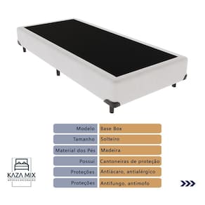 Marca: KazaMix Modelo: Box Cor do Box: Branco Tamanho: Solteiro Dimensões: 88X188X35 (Largura x Comprimento x Altura) Estrutura: Madeira Peso máximo recomendado: 150 kg (Por Pessoa) Altura do Box: 25 cm Altura dos Pés: 10 cm Altura total: 35 cm Garantia: 03 meses Selo Ecologicamente Correto