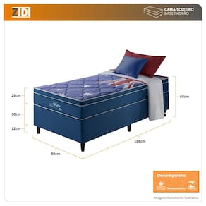 Características: * Nível de Conforto - Intermediário * Colchão com 26 cm de altura. * Colchão de molas ensacadas 2.0mm * Tampo em Malha. * Lateral em Poliéster. * Espuma D26 * Colchão com suporte de peso até 120kg. * Tratamento actiguard -antiácaros, bactérias e fungos-. * Box de eucalipto e pinus de reflorestamento revestido com tecido.