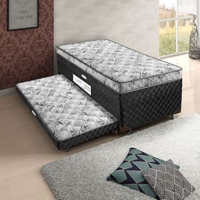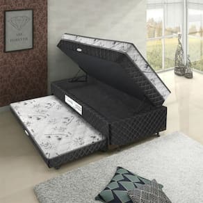 Com o Conjugado Bibox Carol você poderá armazenar travesseiros ou cobertas em seu baú, assim você economiza espaço no quarto com muita facilidade, basta levantar o box. Além disso, o produto tem uma peça coringa que é a cama auxiliar que pode ser utilizado quando precisar podendo acomodar mais uma pessoa. Sua estrutura composta por madeira de eucalipto e espuma flexível de poliuretano, pés em PVC tabaco.