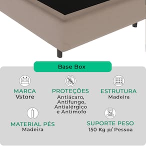 A tecnologia que a sua casa merece está na V-Store!A Base Box Bravus da V-Store une funcionalidade e elegância, sendo a escolha perfeita para quem busca praticidade e durabilidade. Feita com madeira reflorestada, ela oferece excelente sustentação para o seu colchão, enquanto seu revestimento em tecido sintético garante resistência e facilidade de manutenção. Seu design compacto e sofisticado complementa a decoração do quarto com estilo.Com capacidade para 150 kg por pessoa e Selo Ecologicamente Correto, a Base Box Bravus oferece resistência, sustentabilidade e versatilidade para o seu ambiente.Adquira já a sua Base Box Bravus V-Store e transforme seu dormitório com qualidade e estilo!CARACTERÍSTICAS DO PRODUTOMarca: V-StoreModelo: BravusEstrutura: MadeiraPeso máximo recomendado: 150 kg (Por Pessoa)Altura do Box: 26 cmAltura dos Pés: 6 cmAltura total: 44 cmGarantia: 12 Meses (Estrutura) / 3 meses (Tecido)Selo Ecologicamente CorretoAtenção:- Antes de finalizar sua compra, recomendamos que verifique se as dimensões do produto são adequadas para serem transportadas pelos elevadores, portas, escadas e corredores de sua residência. Ressaltamos que não nos responsabilizamos pelo transporte do produto por meios específicos, como escadas, guinchos ou içamentos.- É possível que hajam leves variações de cor de acordo com o dispositivo que está sendo utilizado como smartphones, computadores, monitores e outros.
