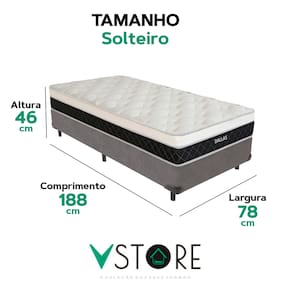 A tecnologia que a sua casa merece está na V-Store! O Conjunto Colchão Dallas e Base Box Bravus oferece a combinação perfeita de conforto, durabilidade e estilo. O Colchão Dallas, com molas ensacadas, espuma D33, Euro Pillow e tecnologia EPS, proporciona excelente suporte e conforto térmico. Já a Base Box Bravus, feita com madeira reflorestada e revestida com tecido sintético, garante resistência, durabilidade e um design sofisticado que complementa qualquer ambiente. Ideal para quem busca praticidade e elegância no quarto. Adquira já a sua Base Box Bravus V-Store e transforme seu dormitório com qualidade e estilo!Característica Do Colchão: Modelo: DallasMarca: V-StoreTamanho: SolteiroDimensões: 78x20x188 (Largura x Altura x Comprimento)Conforto: MédioSistema: Molas EnsacadasPillow: Euro PillowPeso Máximo recomendado: 150 kg (Por pessoa)Proteções: Antiácaro, antialérgico, antifungo, antimofoGarantia: 12 Meses (Espuma) / 10 anos ( Conjunto de Molas Ensacadas)Característica Da Base: Marca: V-StoreModelo: BravusCor do Box: CinzaTamanho: SolteiroDimensões: 78x44x188 (Largura x Altura x Comprimento)Estrutura: MadeiraPeso máximo recomendado: 150 kg (Por Pessoa)Altura do Box: 26 cmAltura dos Pés: 6 cmAltura total: 44 cmGarantia: 12 Meses (Estrutura) / 3 meses (Tecido)Selo Ecologicamente CorretoAtenção:- Antes de finalizar sua compra, recomendamos que verifique se as dimensões do produto são adequadas para serem transportadas pelos elevadores, portas, escadas e corredores de sua residência. Ressaltamos que não nos responsabilizamos pelo transporte do produto por meios específicos, como escadas, guinchos ou içamentos.- É possível que hajam leves variações de cor de acordo com o dispositivo que está sendo utilizado como smartphones, computadores, monitores e outros.