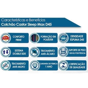Abaixo segue os produtos do KIT: Conjunto Box Solteiro: Colchão Espuma Castor D45 Sleep Max + Base CRC Courano White (88x188)