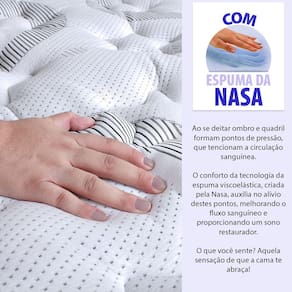 - Pillow top: Com camada de Espuma Viscoelástica também conhecida como espuma da nasa, ela irá absorver perfeitamente a pressão causada ao deitar-se, adaptando-se completamente a seu corpo e mantendo-o confortável durante o sono.