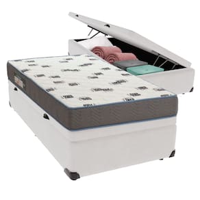 Base Box com Baú: Marca: Ortobom; Cor do Box: Branco; Material dos pés: Madeira; Estrutura: Madeira; Peso máximo recomendado: até 150kg de cada lado; Altura do Box: 25cm; Altura dos pés: 10cm; Altura total: 35cm; Garantia: 03 meses; Selo Ecologicamente Correto.