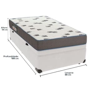 Base Box com Baú: Marca: Ortobom; Cor do Box: Branco; Material dos pés: Madeira; Estrutura: Madeira; Peso máximo recomendado: até 150kg de cada lado; Altura do Box: 25cm; Altura dos pés: 10cm; Altura total: 35cm; Garantia: 03 meses; Selo Ecologicamente Correto.