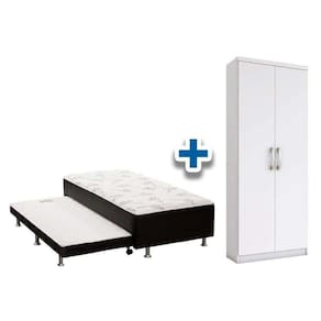 Cama Box Solteiro Conjugado Ortobom Black C/ Auxiliar + Armário Multiuso Margarida Branco