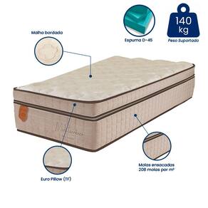 Com estrutura em molas ensacadas com 208 molas por m² que se adaptam a curvatura e formato do corpo, espuma D-45 que juntos garante maior estabilidade ao seu corpo, tornando sua noite de sono muito mais confortável, além de oferecer uma maior sustentação de peso com capacidade para suportar até 140 Kg por pessoa. Além do mais, ele também traz um Euro Pillow Turn Free, que serve como uma camada extra de espuma proporcionando melhor alinhamento e acabamento ao colchão, revestimento em malha bordado, tratamento antimofo, antifungos, antiácaros e antialérgico, tudo para que você possa usufruir e aproveitar ao máximo de um sono tranquilo, relaxado e saudável.