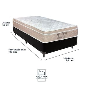 Modelo: Box Marca: KazaMix Cor: Preto Tamanho: Solteiro Dimensões: 88x188x37 (Largura x Comprimento x Altura) Altura dos pés: 5 Altura Total: 37 Peso Máximo recomendado: 150 kg (Por pessoa) Proteções: , , , Garantia: 3 Meses pelo fabricante
