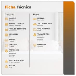 Um colchao precisa de um otimo box para ficar seguro e estavel, que seja forte e bonito e e isso que nosso box oferece. O box e produzido com madeira de Eucalipto para garantir uma estrutura firme e resistente. O acabamento em suede da um toque sofisticado e moderno a base, facilitando tambem a limpeza dela. Para proporcionar ainda mais estabilidade, os pes sao de plastico.