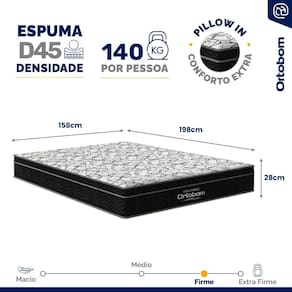 Procurando um colchão que ofereça tanto conforto quanto suporte? Nosso colchão com espuma D45 e pillow in é a escolha ideal para quem busca um descanso firme. Ele suporta até 140 kg por pessoa, garantindo uma base sólida e confortável para uma excelente noite de sono.