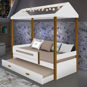 MDF 15mm / Estrado Madeira PinusCama Casa Sara Brancocom Cordão de Luzes LED e Cama Auxiliar com 2 colchões