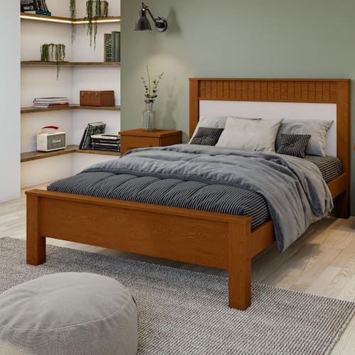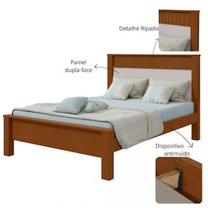 Características: Estrutura em MDF/MDP Pés em MDF com espessura de 74mm Barras laterais em MDF de 25mm Estrado em MDF de 6mm Ideal para colchões de 1380mm Detalhe frisado Painel dupla-face 5 Travessões Dispositivo antirruído