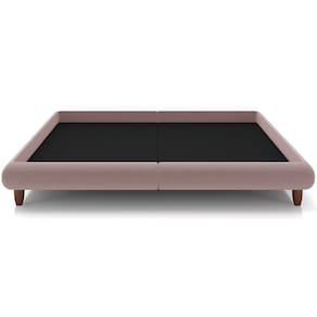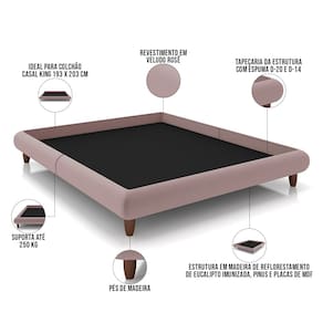Características: Estrutura em madeira de reflorestamento de eucalipto imunizada contra mofo, cupim e micro-organismos, pinus e placas de MDF. Revestimento em Veludo na cor Rosê. Tapeçaria da estrutura com espuma D-20 e D-14. Ideal para colchão casal king 193 x 203 cm. Não acompanha colchão e cabeceira. Pés de madeira. Peso suportado: Até 250 kg.
