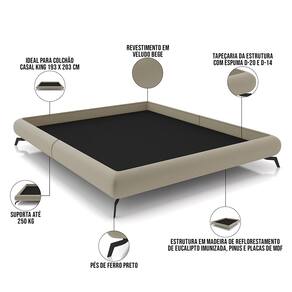 Características: Estrutura em madeira de reflorestamento de eucalipto imunizada contra mofo, cupim e micro-organismos, pinus e placas de MDF. Revestimento em Veludo na cor Bege. Tapeçaria da estrutura com espuma D-20 e D-14. Ideal para colchão casal king 193 x 203 cm. Não acompanha colchão e cabeceira. Pés de ferro preto. Peso suportado: Até 250 kg.