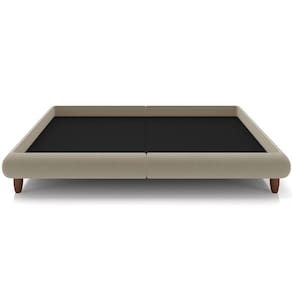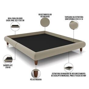 Características: Estrutura em madeira de reflorestamento de eucalipto imunizada contra mofo, cupim e micro-organismos, pinus e placas de MDF. Revestimento em Veludo na cor Bege. Tapeçaria da estrutura com espuma D-20 e D-14. Ideal para colchão casal king 193 x 203 cm. Não acompanha colchão e cabeceira. Pés de madeira. Peso suportado: Até 250 kg.