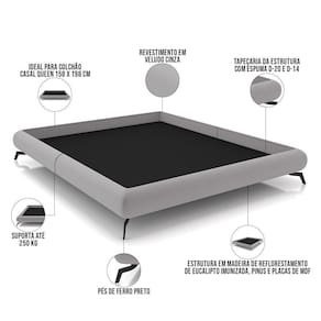 OriginState: PR | Tipo de cama: Casal Queen | ProductHeight: 28 cm | Modelo: Otto | Material: Madeira de Eucalipto, Espuma | Altura: 28 | DepthWidthSideToSide: 210 | ProductWidth: 176 cm | Model: Otto | ColorFamily: Cinza | Tamanho da cama: 176 cm | Cor: Cinza | Largura: 176 | Requer montagem: Sim | ProductWeight: 57 kg | OriginCountry: | Peso: 57 Kg | ColorSimple: Cinza | Peso máximo suportado por cama: 250 kg | ProductWarranty: 90 dias após o do produto | Profundidade: 210 | ColorSupplier: Cinza | ProductLength: 210 cm | Lado a Lado: 210 | Color: Cinza | MaterialFamily: Madeira, Espuma | ProductContents: 01 Cama Queen Box | SizeDescription: Altura: 28 cm x Largura: 176 cm x Profundidade: 57 cm | SupplierSimpleName: Cama Casal Queen Base Box Pés de Ferro Estilo Industrial 176cm Otto P05 Veludo Cinza - Lyam Decor | Depth Front To Back: 210 | ProductInstructions: Produto para uso em ambiente interno, nao devendo ficar exposto ao sol, calor e umidade excessivos.