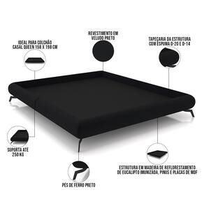 Características: Estrutura em madeira de reflorestamento de eucalipto imunizada contra mofo, cupim e micro-organismos, pinus e placas de MDF. Revestimento em Veludo na cor Preto. Tapeçaria da estrutura com espuma D-20 e D-14. Ideal para colchão casal queen 158 x 198 cm. Não acompanha colchão e cabeceira. Pés de ferro preto. Peso suportado: Até 250 kg.