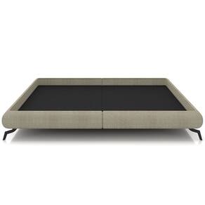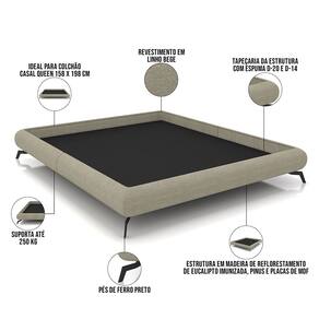 Características: Estrutura em madeira de reflorestamento de eucalipto imunizada contra mofo, cupim e micro-organismos, pinus e placas de MDF. Revestimento em Linho na cor Bege. Tapeçaria da estrutura com espuma D-20 e D-14. Ideal para colchão casal queen 158 x 198 cm. Não acompanha colchão e cabeceira. Pés de ferro preto. Peso suportado: Até 250 kg.