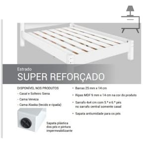Caracteristicas: 100% MDF • Dupla furação • Painel ripado • Pés de 9 x 5,4 cm • 5.º e 6.º pés no sarrafo central • Estrado reforçado Suprema Estrado super reforçado, detalhes: • Barras 25 mm x 14 cm • Ripas MDF 9 mm x 14 cm na cor do produto • Sarrafo 4x4 cm com 5.º e 6.º pés no sarrafo central somente casal • Sapata antiumidade para os pés Acabamento : Pintura UV Altura : 112cmAltura do Estrado até o Chão : 39cmAltura dos Pés : 40cm Largura : 148cm Profundidade : 201cm Suporta Até (kg) : 170kgTamanho do Colchão Indicado (L x C) : 140Tipo de Cama : ConvencionalTipo de Colchão : CasalTipo de Estrado : Fixo