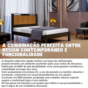 Caracteristicas: 100% MDF • Dupla furação • Painel ripado • Pés de 9 x 5,4 cm • 5.º e 6.º pés no sarrafo central • Estrado reforçado Suprema Estrado super reforçado, detalhes: • Barras 25 mm x 14 cm • Ripas MDF 9 mm x 14 cm na cor do produto • Sarrafo 4x4 cm com 5.º e 6.º pés no sarrafo central somente casal • Sapata antiumidade para os pés Acabamento : Pintura UV Altura : 112cmAltura do Estrado até o Chão : 39cmAltura dos Pés : 40cm Largura : 148cm Profundidade : 201cm Suporta Até (kg) : 170kgTamanho do Colchão Indicado (L x C) : 140Tipo de Cama : ConvencionalTipo de Colchão : CasalTipo de Estrado : Fixo