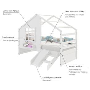 Diferenciais:Casinha com fechamento em MDF, Janela e Prateleira para Livros e Decoração, Kit Escada/ Escorregador, Montagem Reversível (Lado Direito ou Lado Esquerdo)