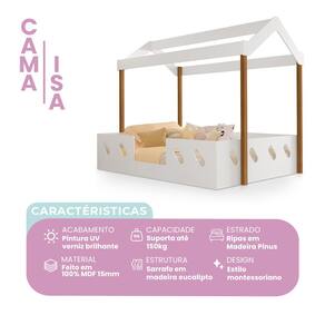 CARACTERÍSTICAS TÉCNICAS Tipo: Cama Infantil Montessoriana Modelo: Isa Material: 100% MDF (15 mm) Acabamento: Pintura UV com verniz brilhante Cor: Branco Estrutura: Sarrafo em madeira eucalipto Estrado: Ripas em madeira pinus Capacidade: Suporta até 150kg Acompanha luminária nuvem com entrada USB